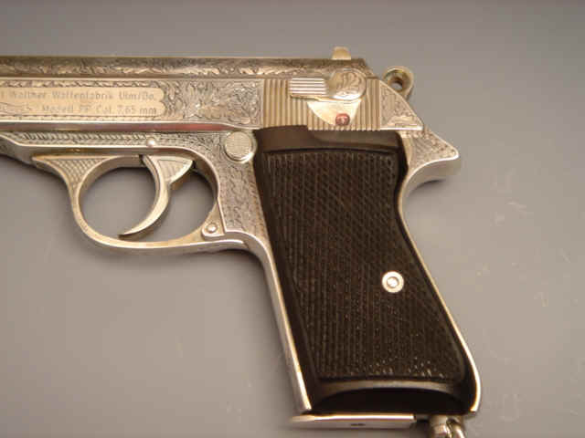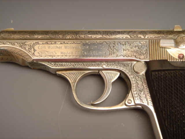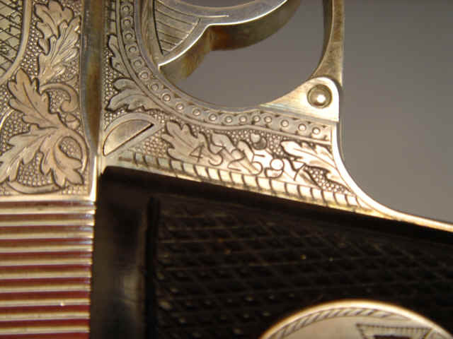 engraving to slide, frame, backstrap, safety catch and triggerguard. Right side of frame