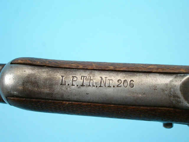 gripstrap marked: L.P. Th. Nr. 206. Checkered walnut grips. Magazine with wooden base.