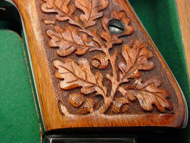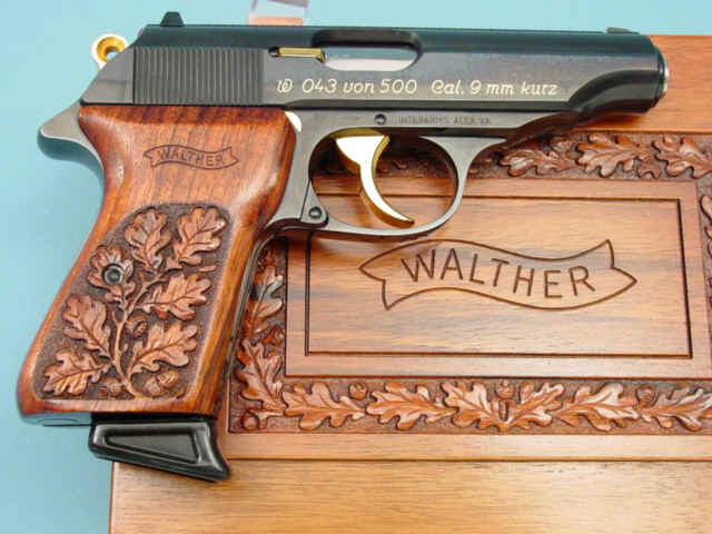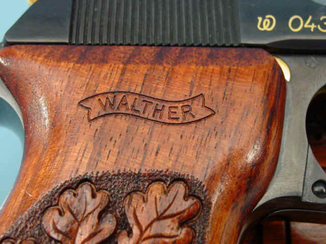 With deluxe wood box carved with oak leaf motif on lid and with WALTHER logo; extra