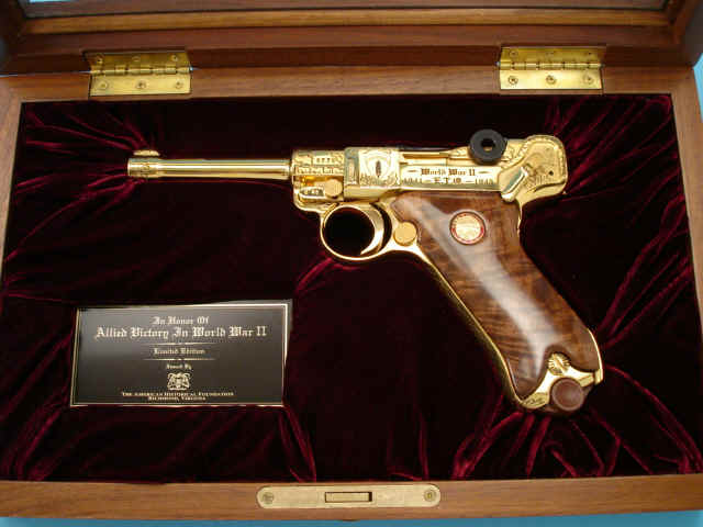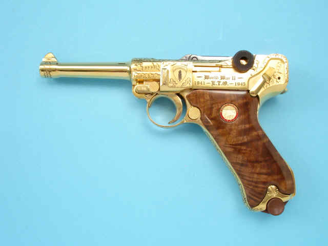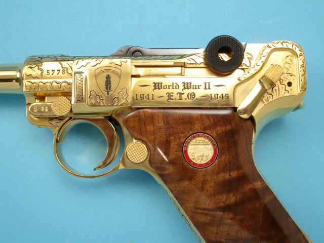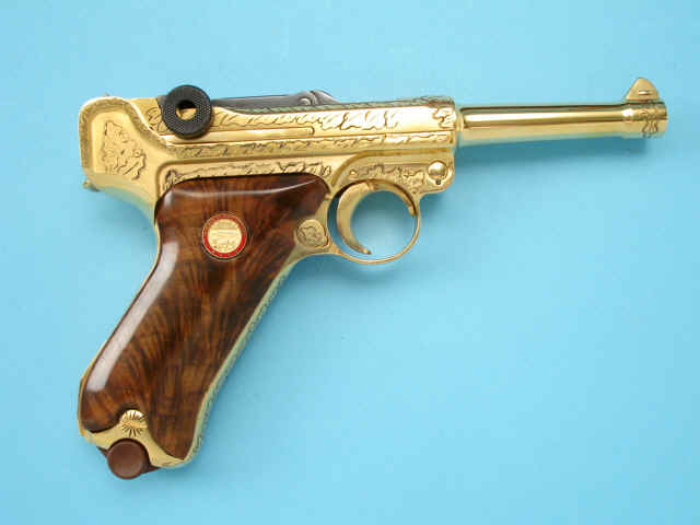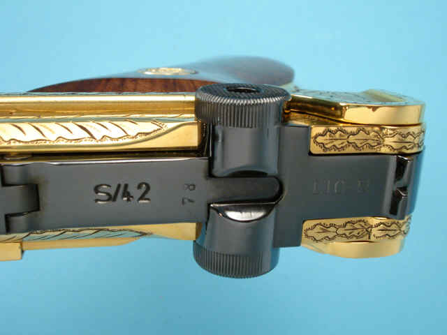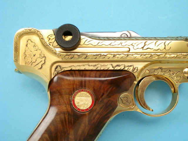 Serial no. 5778, 9mm, 4-inch barrel, Gold-plated finish. Oakleaf motifs. Smooth walnut