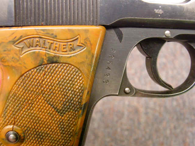 Serial no. 835433, 7.65mm caliber, 3 3/8-inch barrel; blued finish; checkered brown