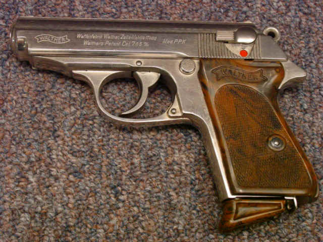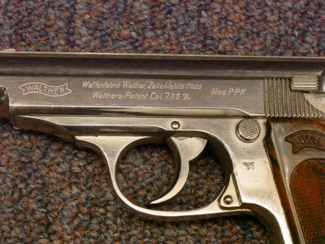 Lot 2197 Detail *Walther Model PPK Semi-Auto Pistol, Eagle C Police Variation Serial no. 358414k, 7.65mm caliber, 3 5/16-inch barrel, nickel-plated; checkered brown plastic grips. Condition: Fine; old nickel-plating. Estimate: $600 - $800