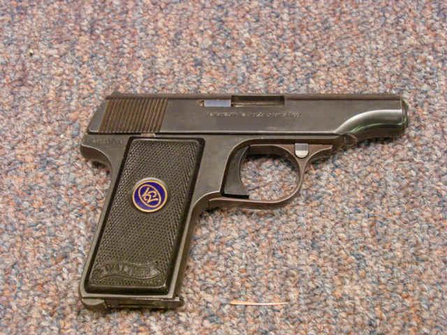 Lot 2209 Detail Walther Model 8 Semi-Auto Pistol Serial no. 723656, 6.5mm caliber, 2 13/16-inch barrel; blued, with black checkered plastic grips. Condition: Fine. Estimate: $400 - $600