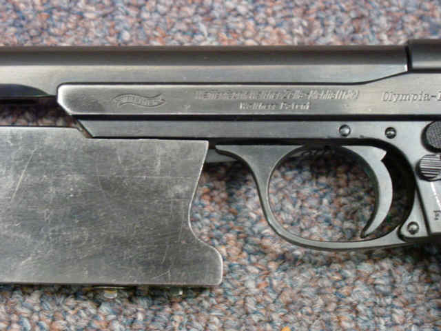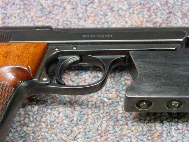 varnished walnut grips. Extra magazine. Steel weight block mounted on front of frame.