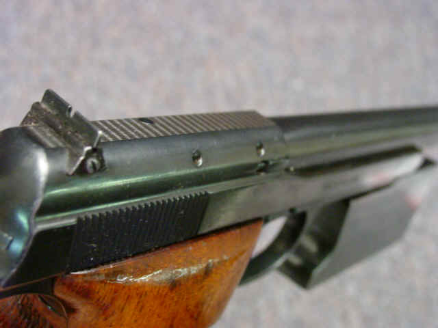 barrel, and with aperture on bottom of frame for weight system. Checkered thumbrest