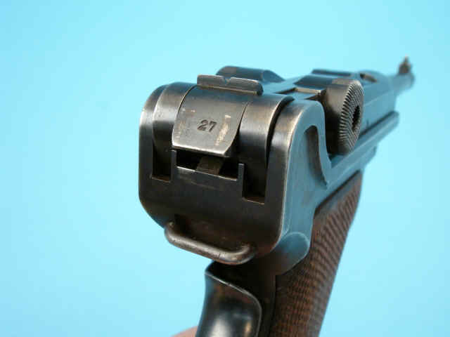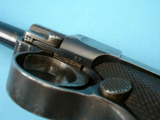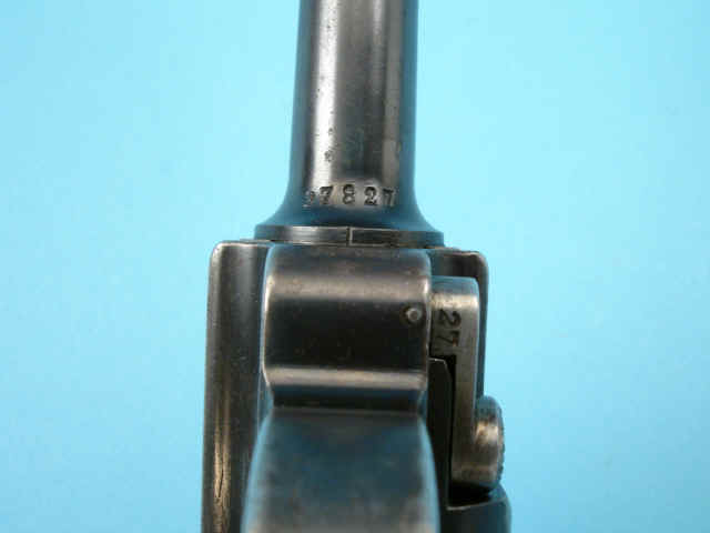 Serial no. 27827, 7.65mm, 4 1/2-inch barrel. Blued finish. Grip safety. Checkered