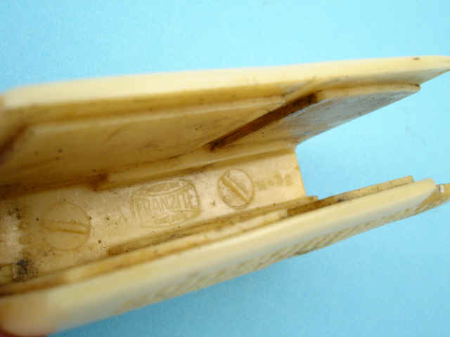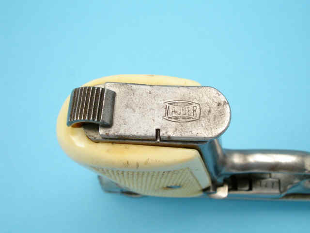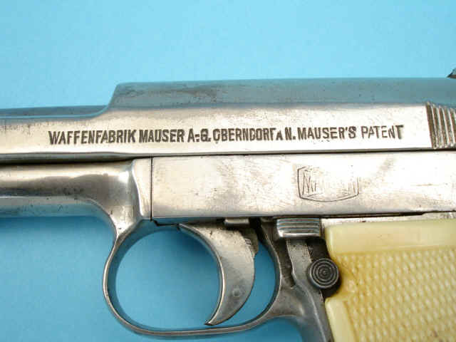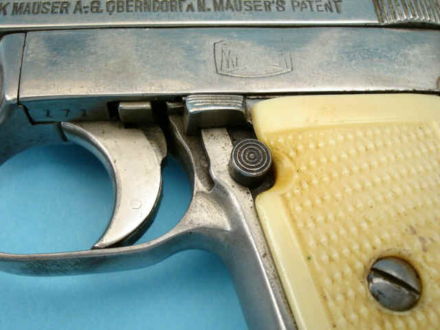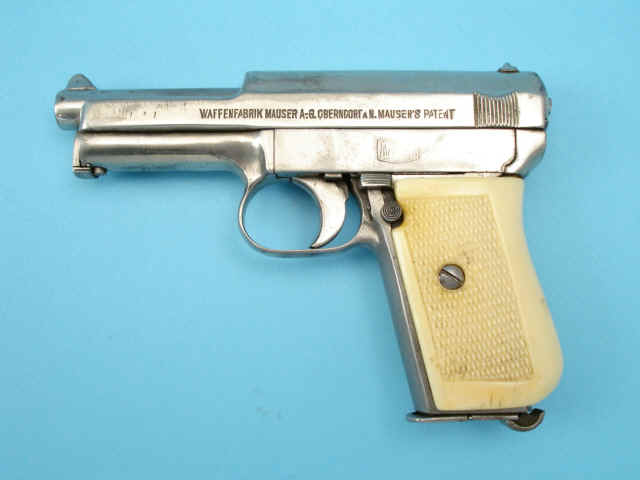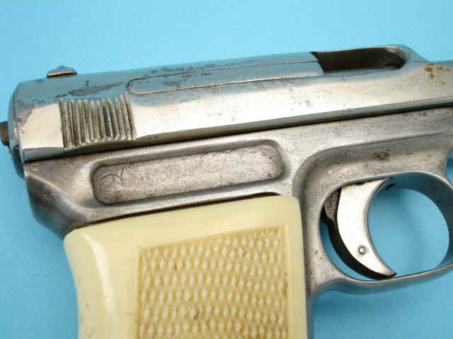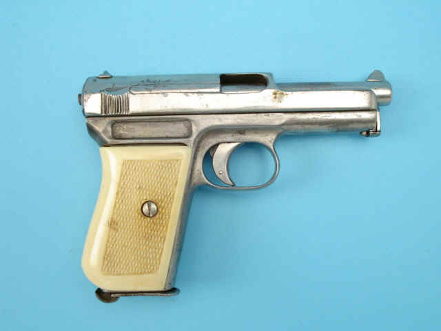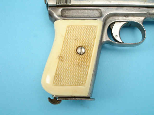 Serial no. 1171, 7.65mm, 3 1/4-inch barrel. Nickel-plated finish. Ivory plastic grips.