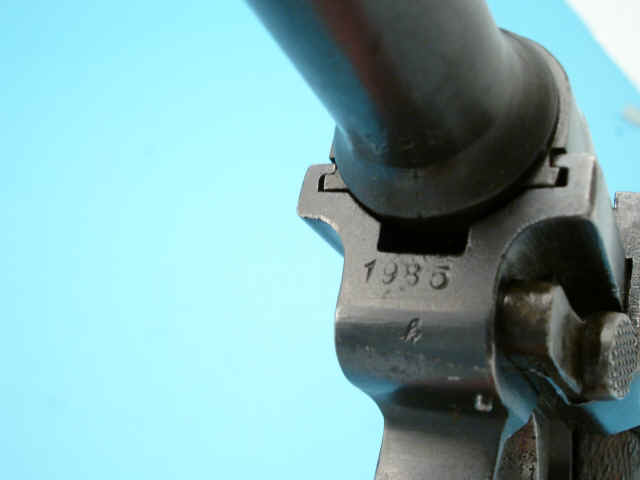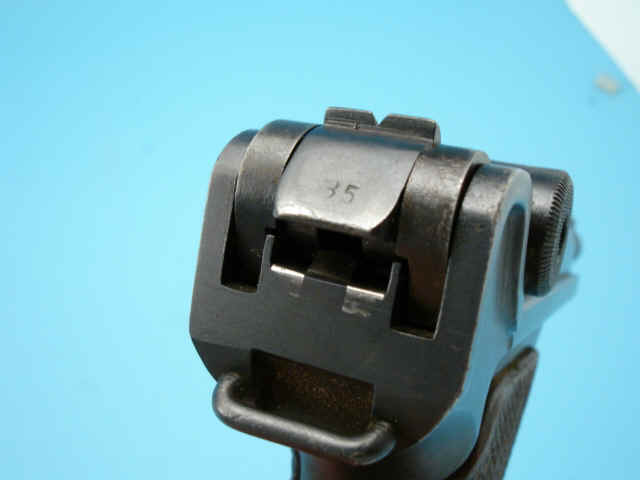 Serial no. 1985, 9mm, 3 3/4-inch barrel. Blued finish. Checkered walnut grips. Aluminum