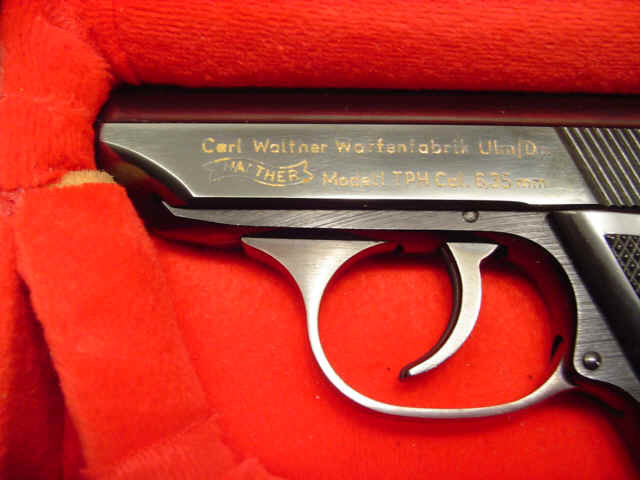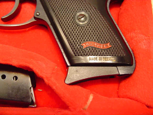 markings on left side of slide; blued finish with checkered composition grips. In wood