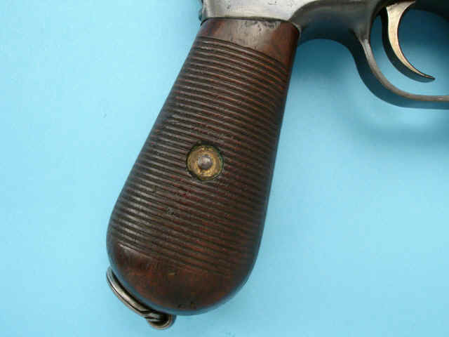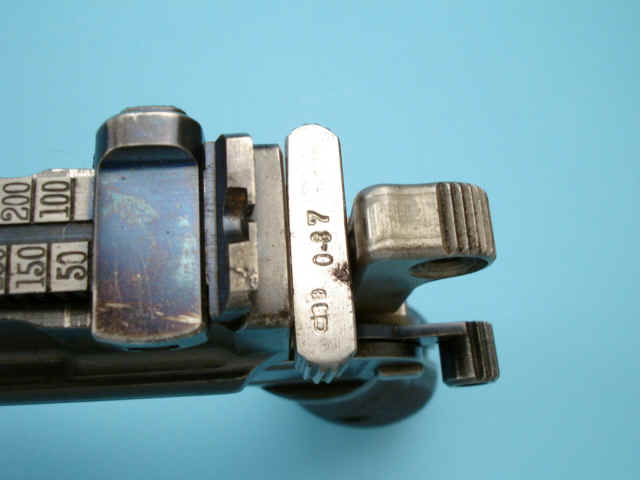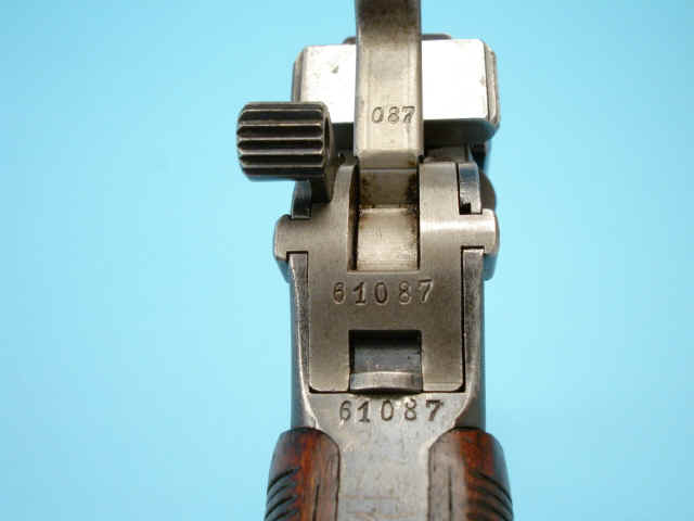 walnut grips. 1000 meter tangent rear sight. Lanyard ring. Top of breech marked