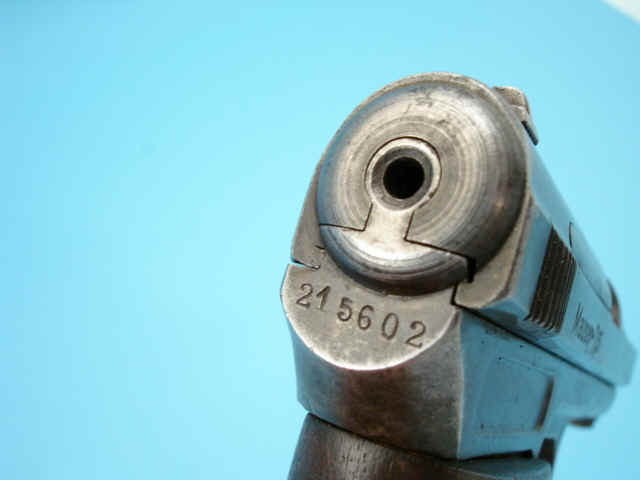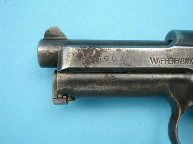 Serial no. 235602, 7.65mm, 3 3/8-inch barrel. Blued finish. Fire-blued trigger. Walnut