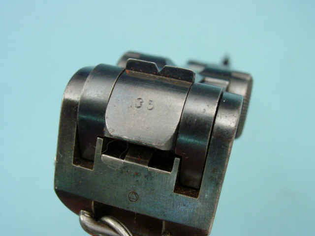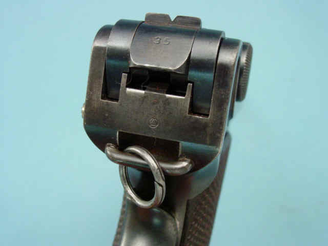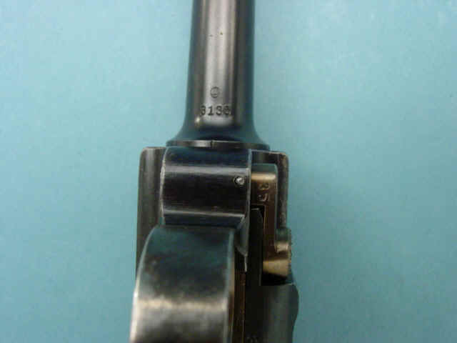 Serial no. 3135, 7.65mm, 4 3/4-inch barrel. Crown over M marking at breech. Blued