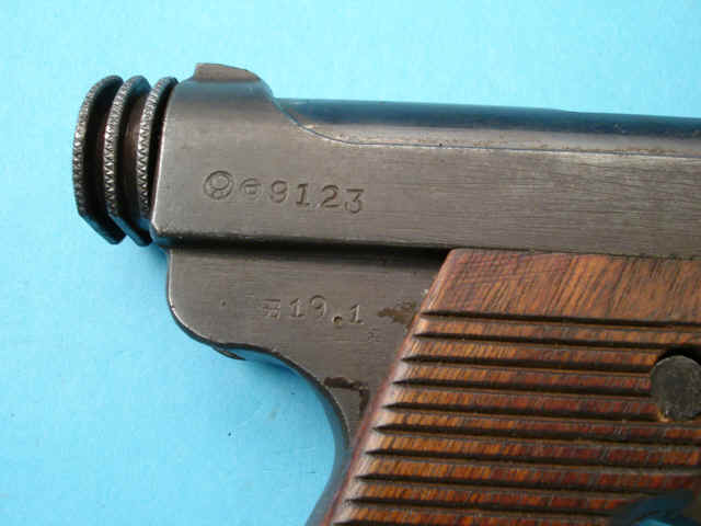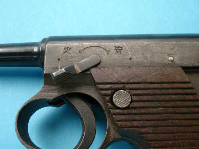 Serial no. 9123, 9mm, 4 3/4-inch barrel. Nagoya arsenal markings. Blued finish. Walnut