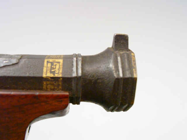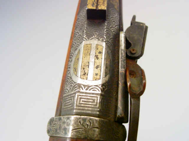 gold and silver dragon and foliage motifs. Fish scale and geometric decoration at breech.