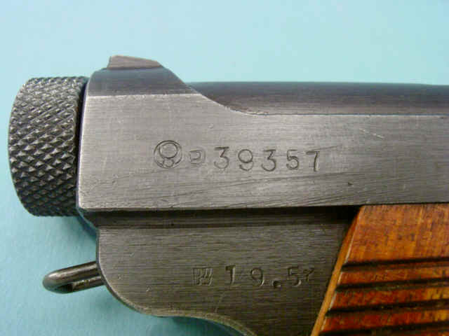 Serial no. 39357, 8mm, 4 1/2-inch barrel. Blued finish. Ribbed walnut grips. Contained