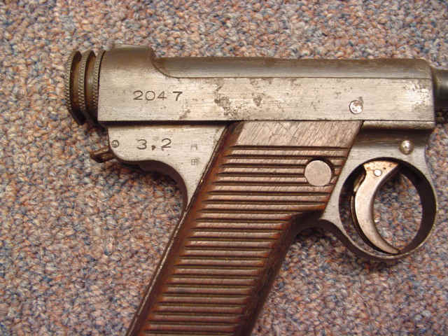 Lot 358 Detail Japanese Type 14 Nambu Semi-Automatic Pistol Serial no. 2047, 8mm caliber, 4 5/8-inch barrel; blued finish; grooved walnut grips. Condition: Very good; pitting and patina; 40% blue, fading. Estimate: $250 - $350