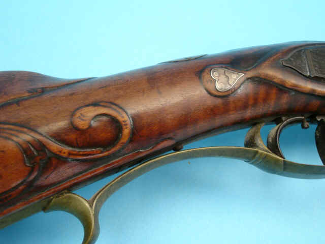 Percussion lock marked: JA. Set-triggers. Relief-carved tiger maple stock with floral