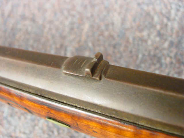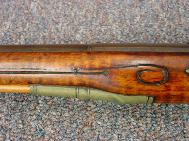 near breech; German silver front sight blade on base dovetailed at muzzle. Single scroll