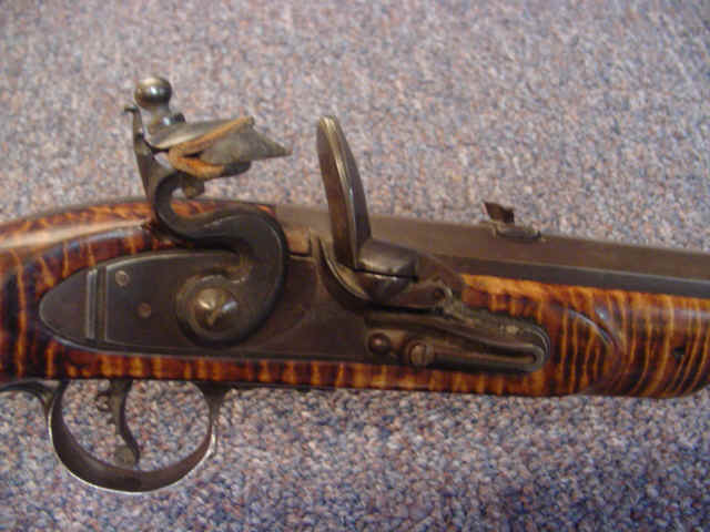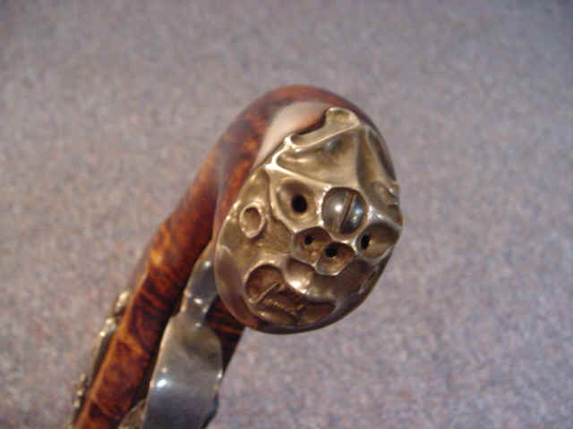 sideplate; silver mounts including grotesque face on buttplate. Varnished curly maple