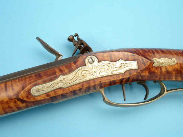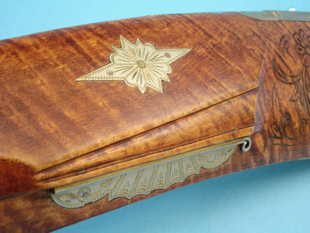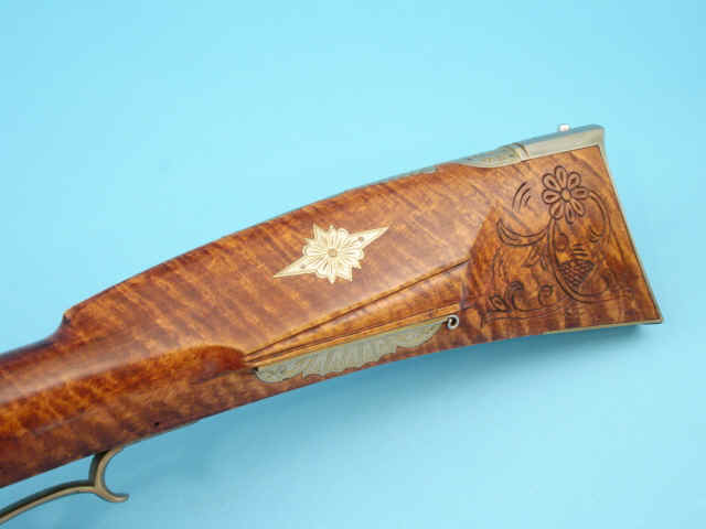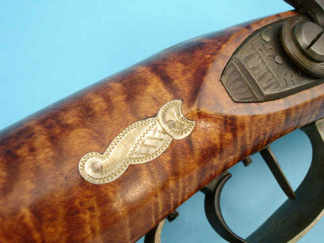 Set triggers. Relief-carved exceptional tiger maple stock with pierced German silver