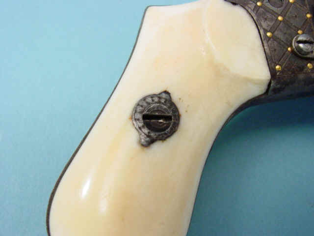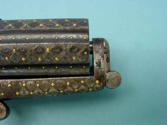 gold-inlaid dots in relief, most within latticework motif; folding spur trigger. Blued.
