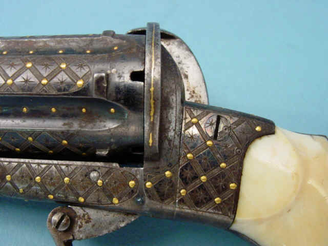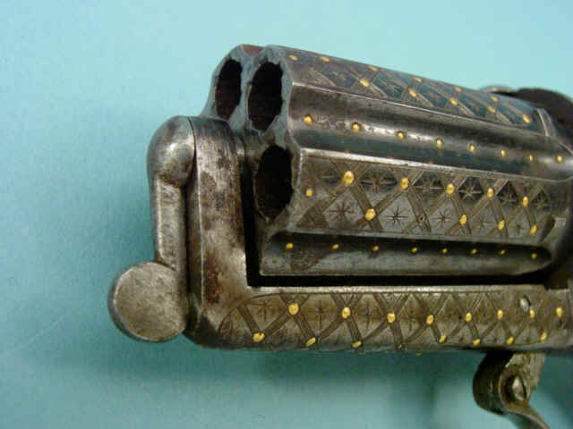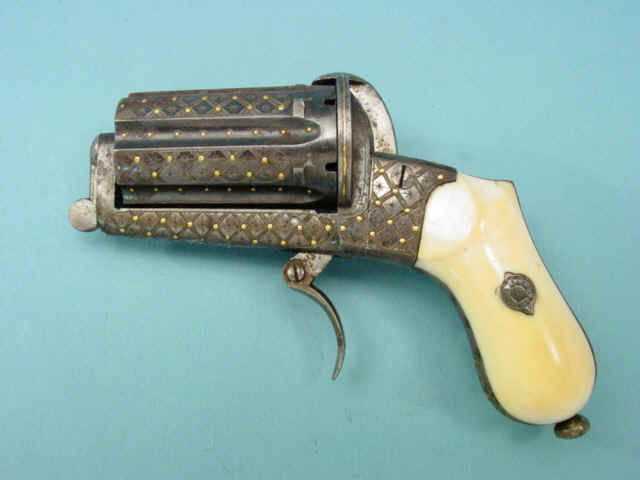 An Engraved and Gold Inlaid Belgian-Made Pinfire Pepperbox Pistol, with Ivory Grips