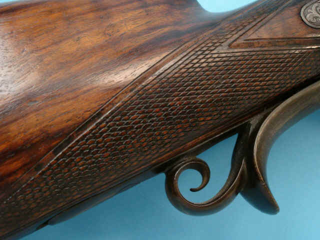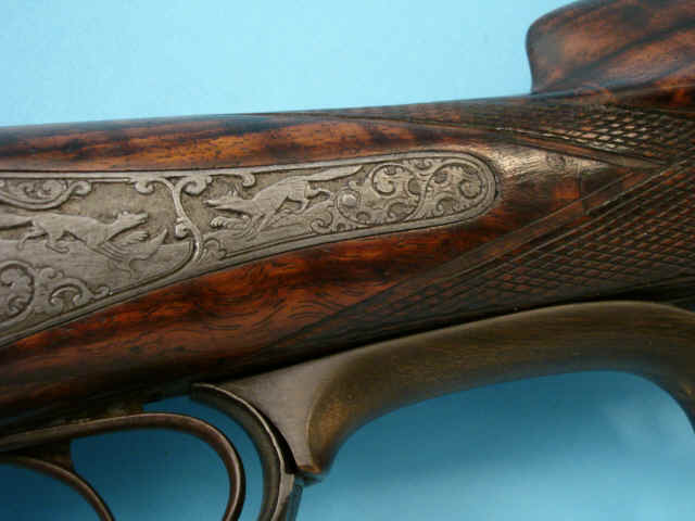 Serial no. 63, 12 gauge improved choke 29 1/2-inch Damascus barrels, scroll engraved