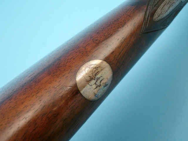 checkered straight grip stock of figured walnut. Silver oval with initials. Steel