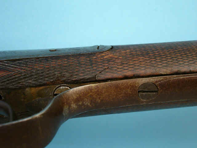 Action/barrels show slight looseness. Stock repaired at grip. Metal splice piece behind