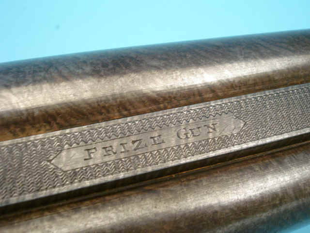 Serial no. 8375. 12 gauge. 32 inch twist barrels. Matted flat twist rib marked: Prize
