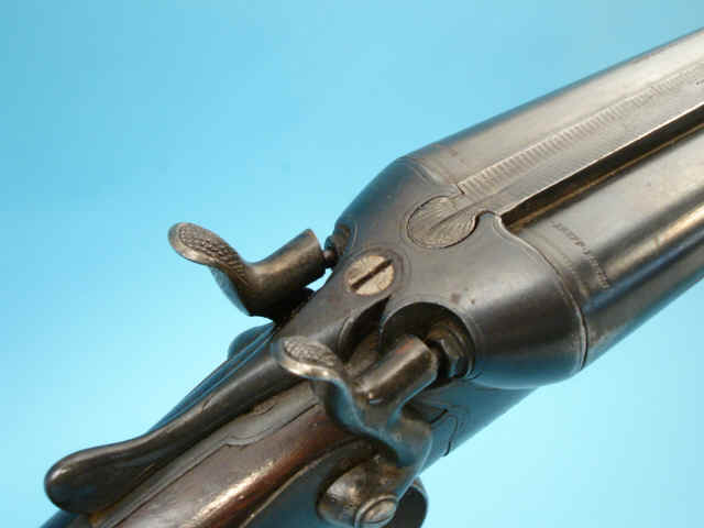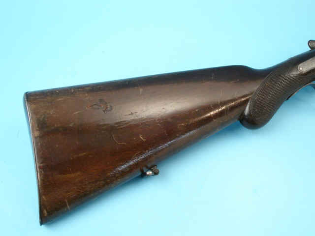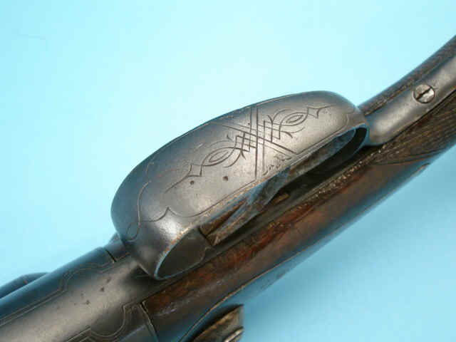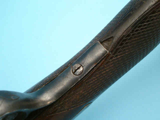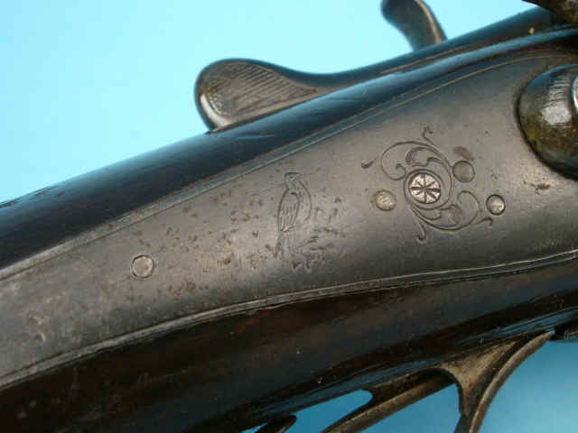 back-action locks. Falcon and foliate detail on locks. Checkered half-pistolgrip stock of