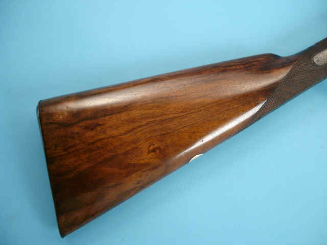 barrel latch. Boldly checkered walnut stocks. Blank oval escutcheon on bottom of