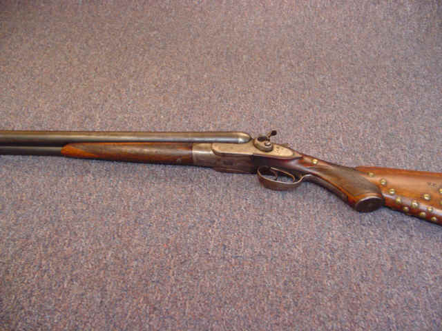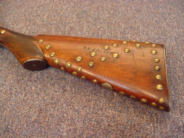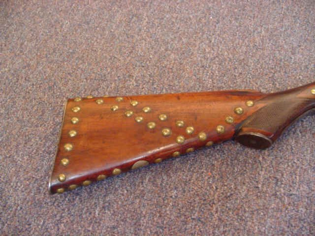 EXP. stamped on left side of buttstock; stock with brass tacks and checkered.