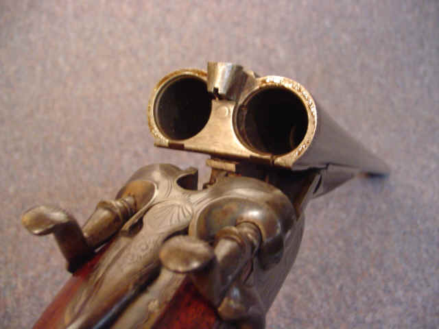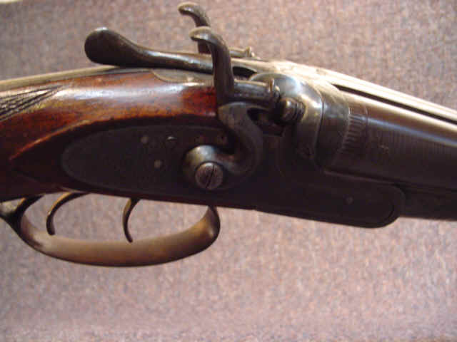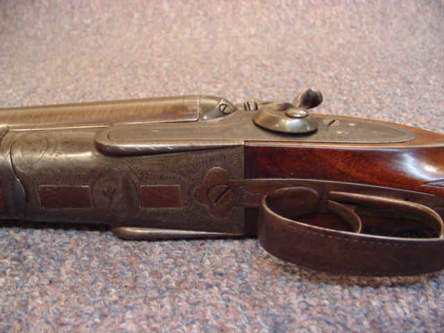 barrel breech, forend mount and triggerguard. Double triggers. Blued and case-hardened