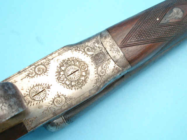 Scroll-engraved and nickel-plated boxlock frame. Double triggers. Thumb safety. Checkered