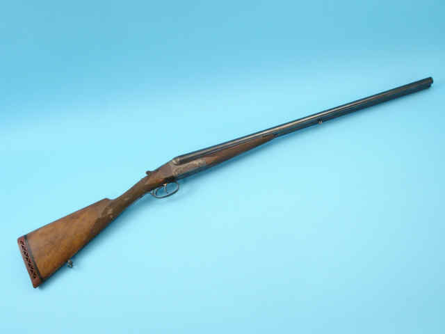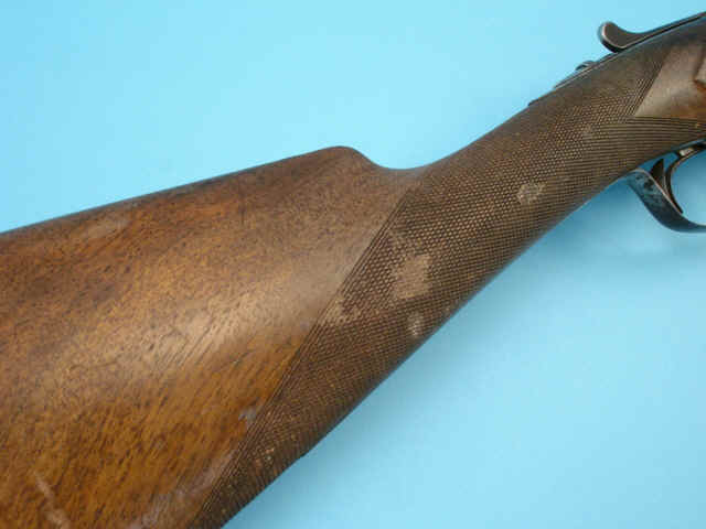 Bores show frosting. Slight dents in both barrels. Action shows 70-80% case colors. Right