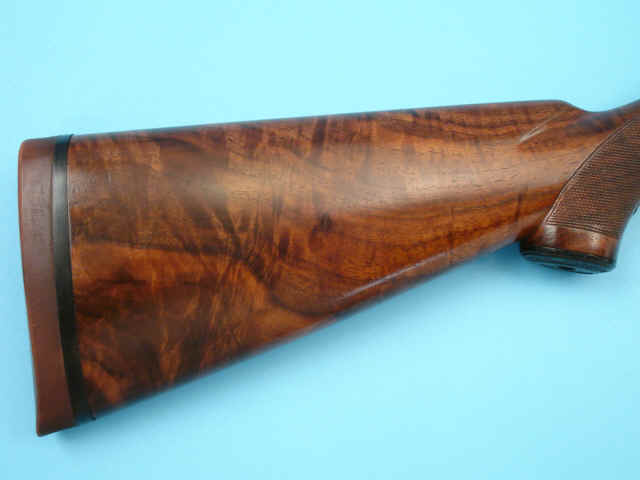 highly figured walnut. Maker's recoil pad. Maker's hard rubber grip cap with inscription.