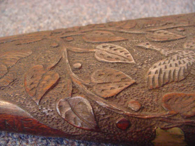 of retriever with bird in mouth. The buttstock profusely carved in aftermarket decoration