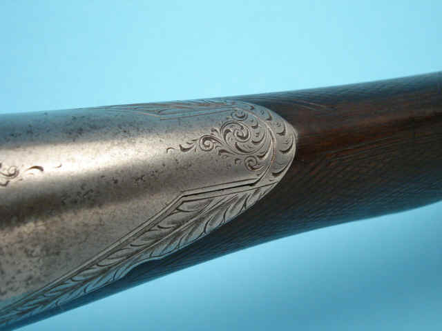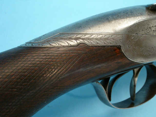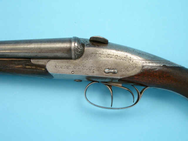 sliding-breech action lightly engraved with foliate scroll. Side safety. Carved fences.