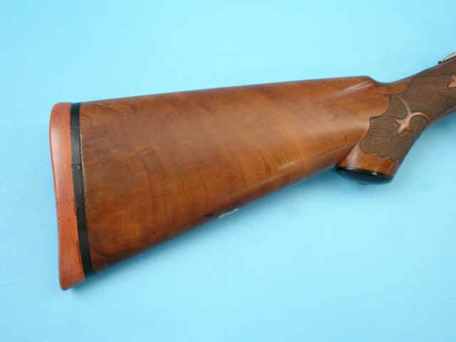 walnut. Checkered panels at head. Vacant gold shield. Silvers-type recoil pad. Beavertail