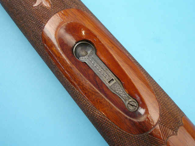 fore-end. Ornate checkering with banding, fleur-de-lis, and scalloped borders.