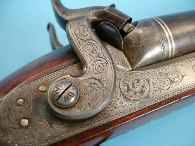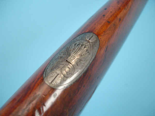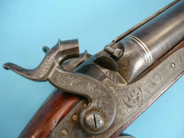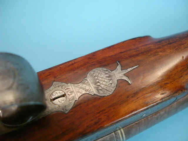 Silver banding at breech. Fine scroll-engraved locks with dolphin hammers. Blank German