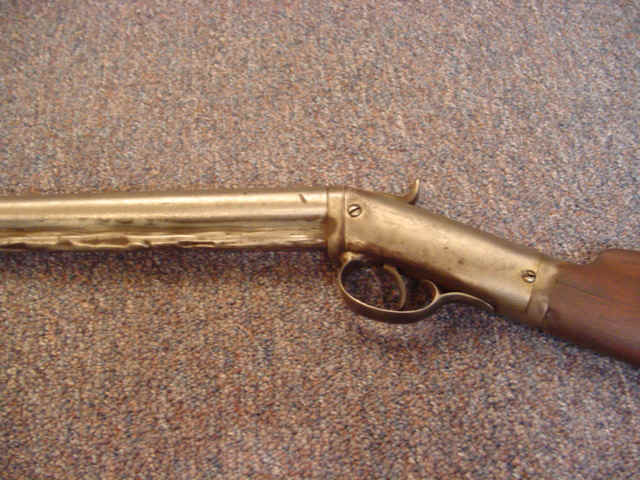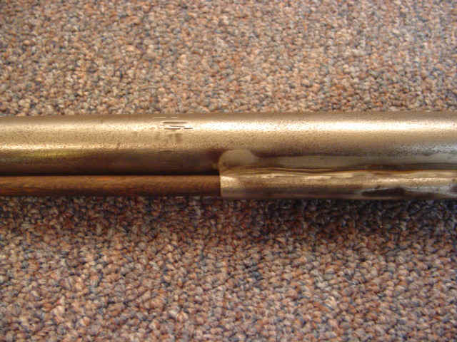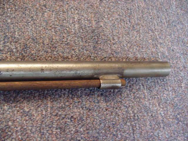 Lot 1657 Detail Percussion Single-Shot Shotgun of New York or New England Manufacture 12 gauge, 30 1/4-inch round barrel; walnut stock. Unmarked. Condition: Good; gray patina and pitting; dents to metal fore-end. Estimate: $250 - $350