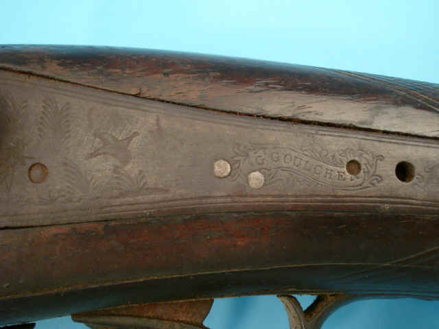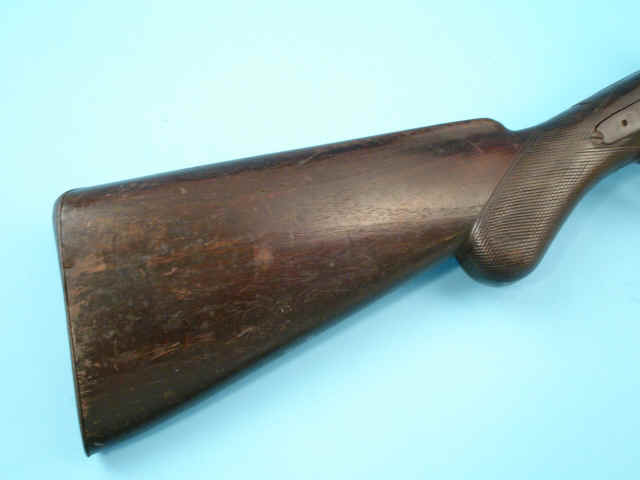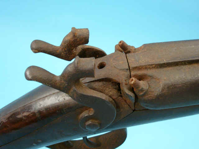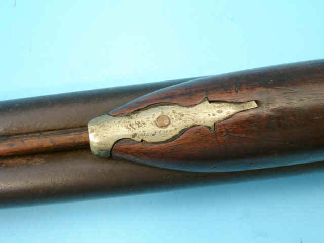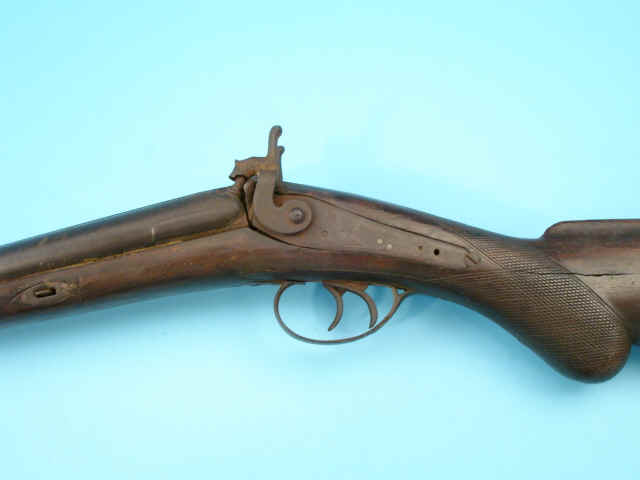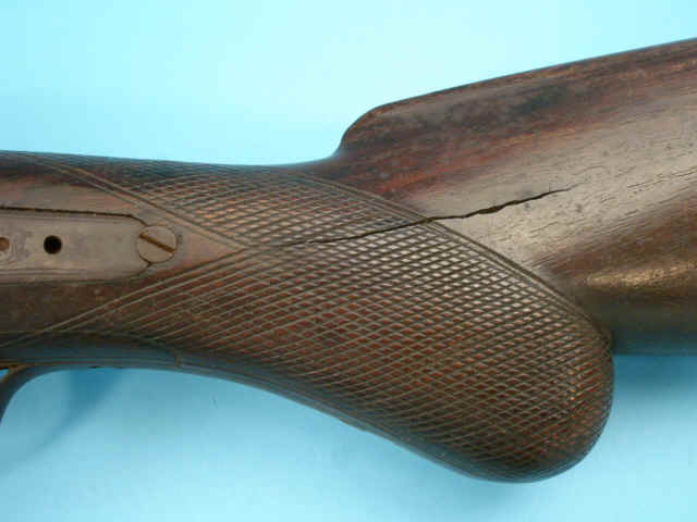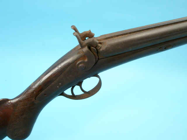 Double triggers. Checkered pistolgrip walnut stock with shotgun butt. Wooden ramrod.