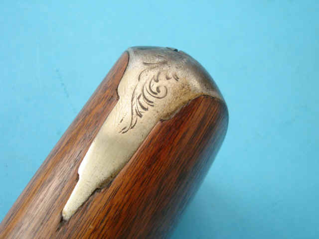 12 gauge, 32-inch Damascus side-by-side barrels with silver inlaid inscription on solid