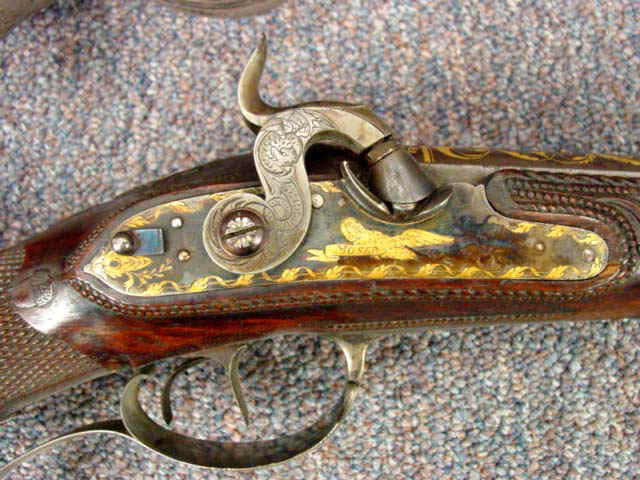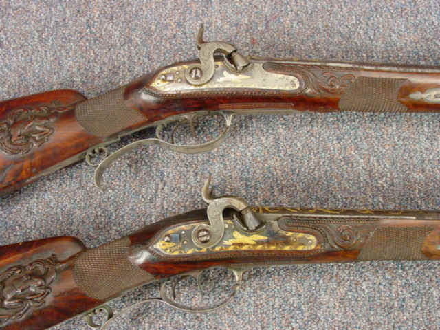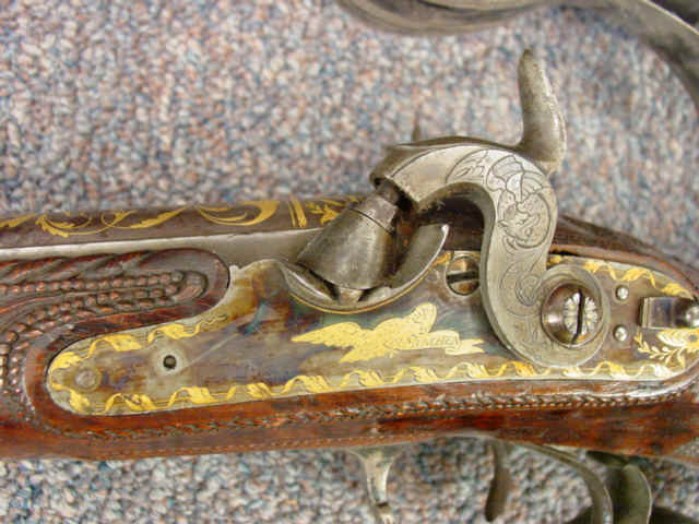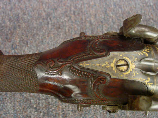 wolf head on each barrel; locks with matching gold inlaid scrolls and borders; gold inlaid