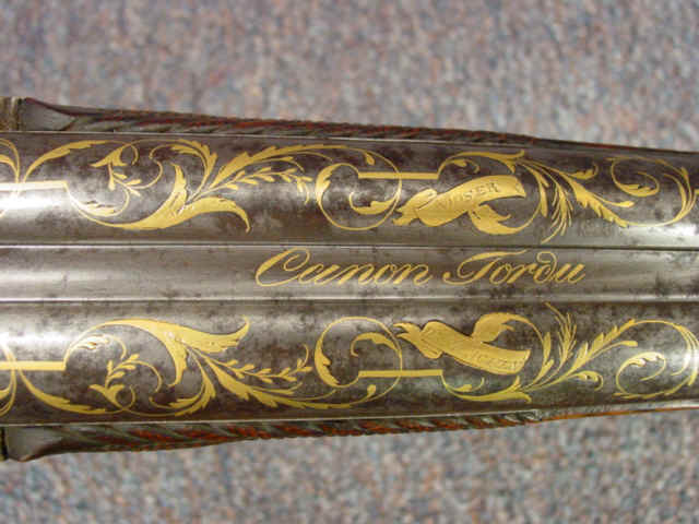 of solid rib gold inlaid "Canon Tordu" in script; left barrel at breech engraved