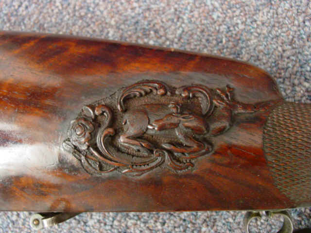 Varnished, checkered and elaborately carved select walnut halftocks; large cheekpiece on