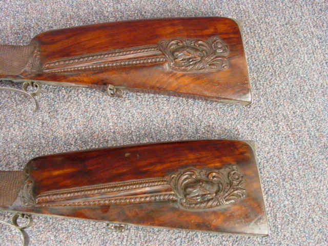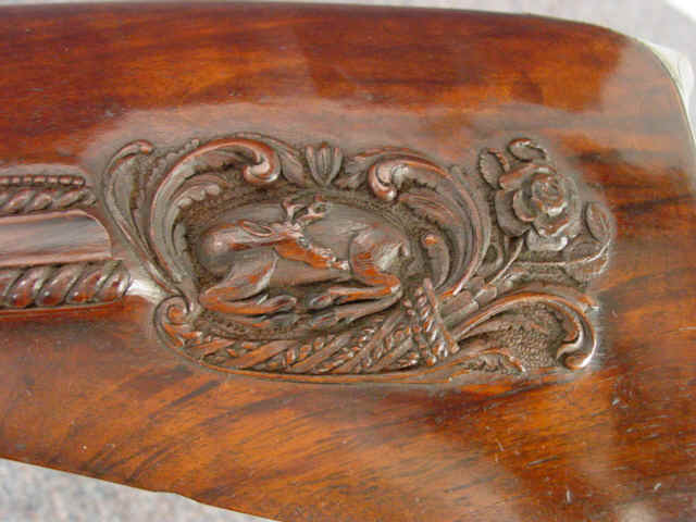 left side of each butt; stock details include scroll panels behind each cheekpiece,