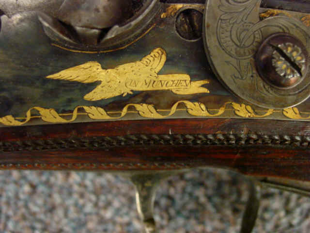 each gun with gold inlaid eagle motif clutching gold banner, engraved IN MUNCHEN. Barrel